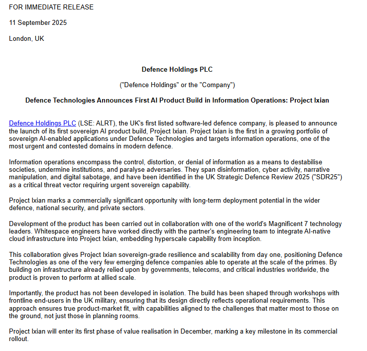Both of Defence Holdings’ classified AI products are fully aligned with the UK Strategic Defence Review 2025 priorities and NATO interoperability objectives.