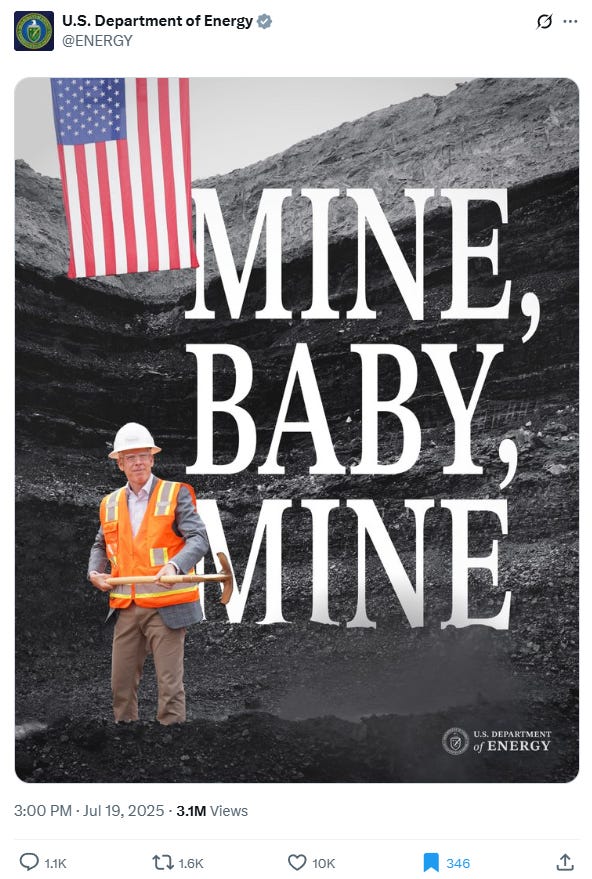 The US government directly backing MP Materials — arguably a weak deposit comprised of mostly light rare earths (the low value ones, which funnily enough, for now, need to be shipped to China to process) — tells you how serious things have become.