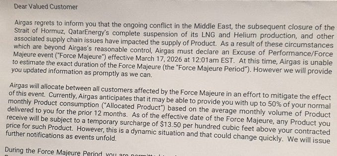 There is a very real, very scary helium supply crisis and spot prices are going bananas. Even if Hormuz opens tomorrow, the infrastructure has been hit hard - and supply chains are going to need to be diversified in case it ever happens again.